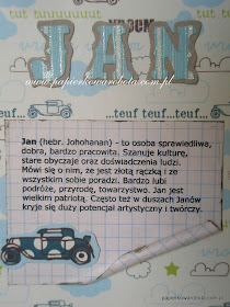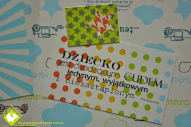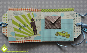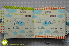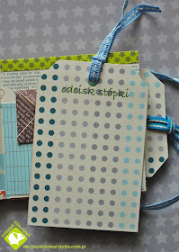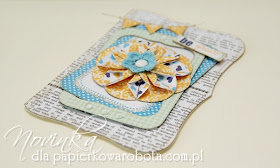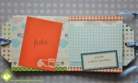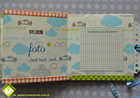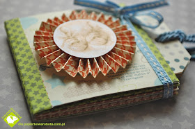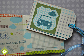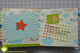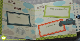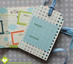 Ewa wykonała piękny mini albumik inspirując się kursem Tima Holtza  (kursik na album tutaj). Jego wymiary to: 7.5 x 9.5 cm - prawdziwy maluszek :-) Jest to album na narodziny chłopca - znajduje się w nim miejsce na kilka szczegółów, które warto zapamiętać z tego dnia, a także miniaturowa koperta (może na kosmyk włosków?)